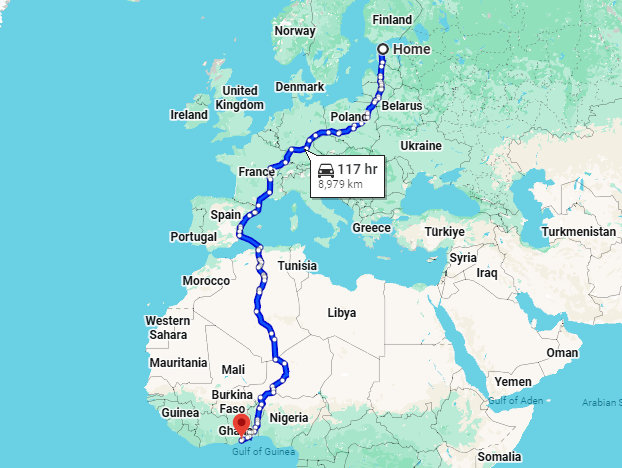 Approximate distance from Tallinn to Accra 8979 km screenshot from Google maps |