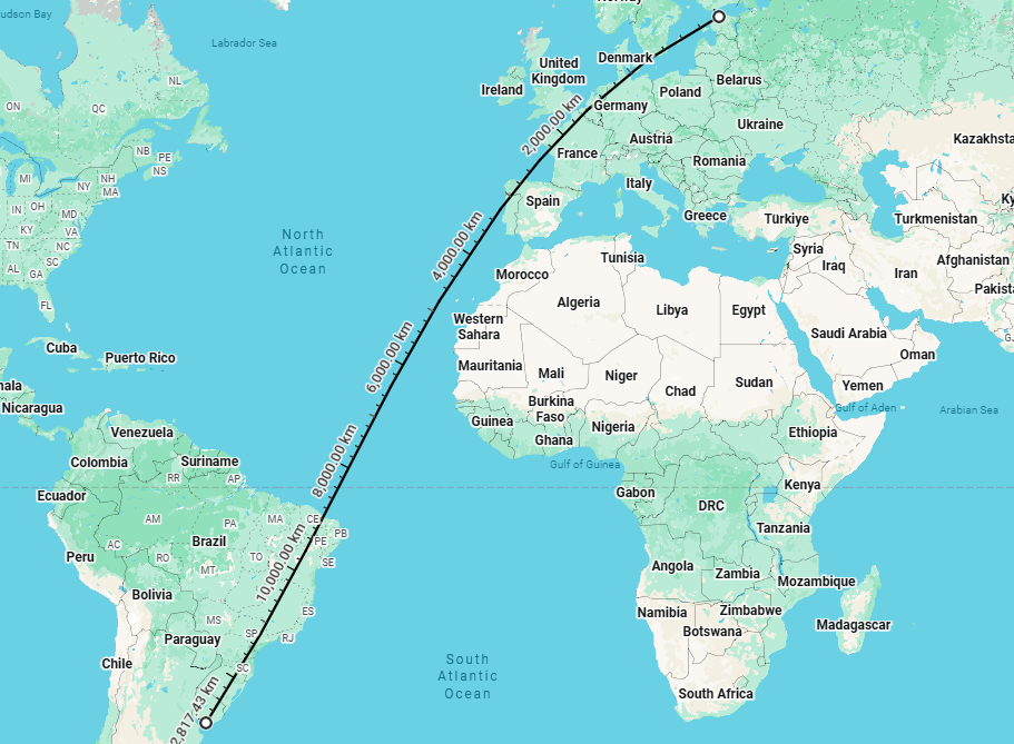 Direct distance from Tallinn to Montevideo appr. 12815 km screenshot from Google maps |